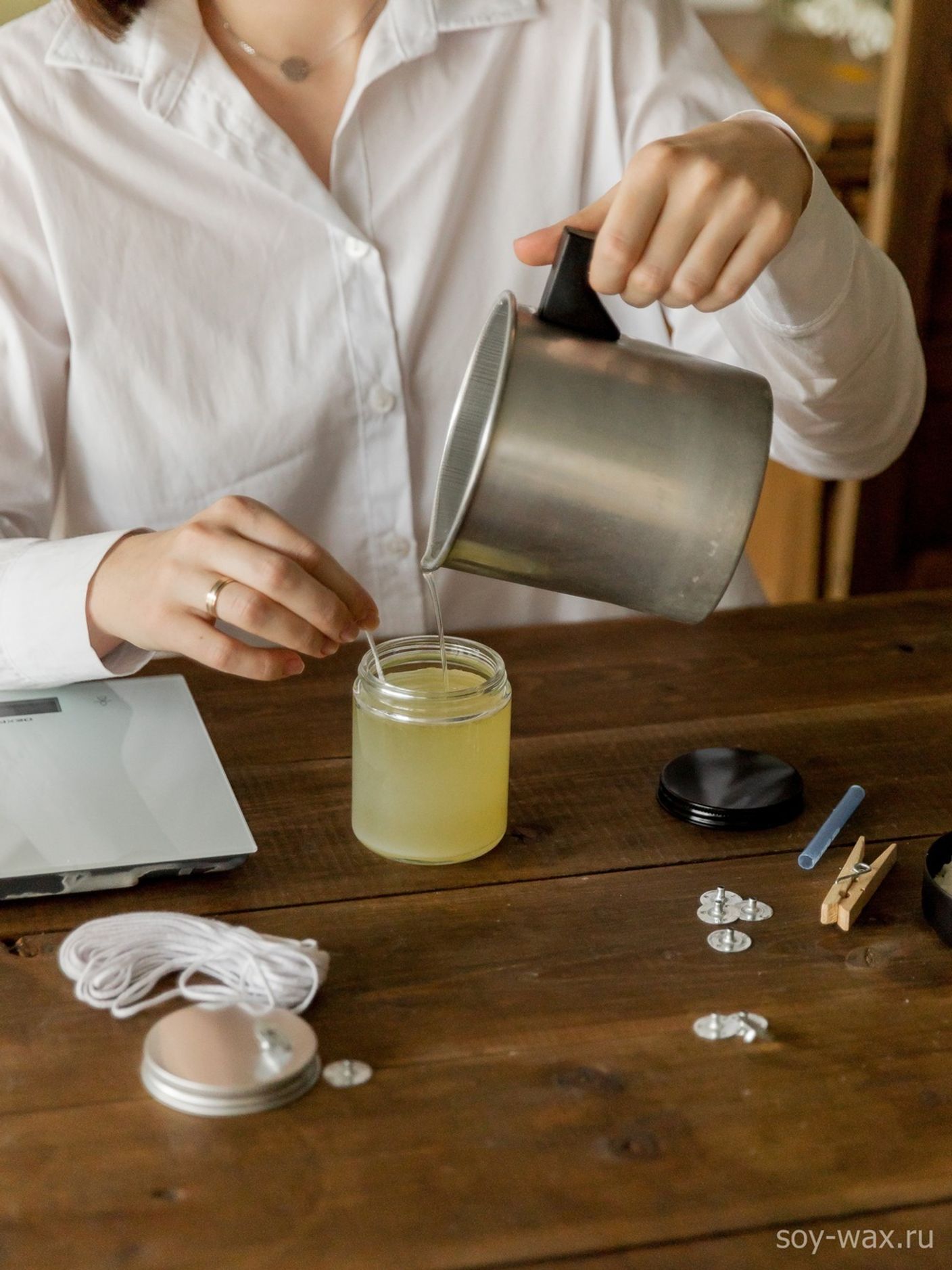 - Заливка нашего соевого воска в +/- 42C, но воск должен быть мутным.