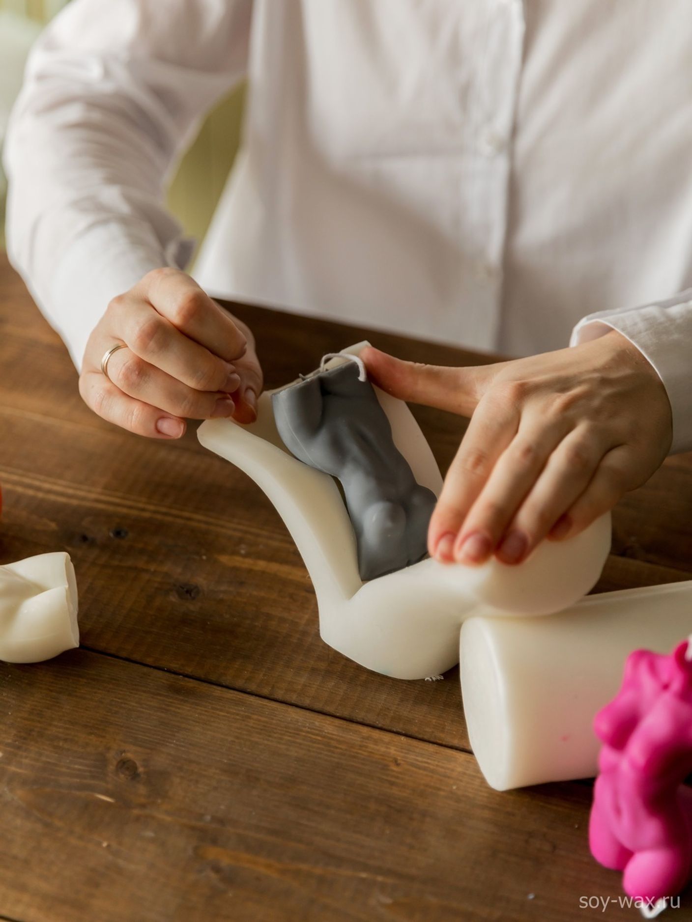 11) Вытаскиваем свечу аккуратно, медленно отделяя форму от самой свечи. Если свеча еще не застыла, она сломается. Время застывания напрямую зависит от веса свечи и температуры в помещении. Женский торс (100г) застывает через 15-30 минут.