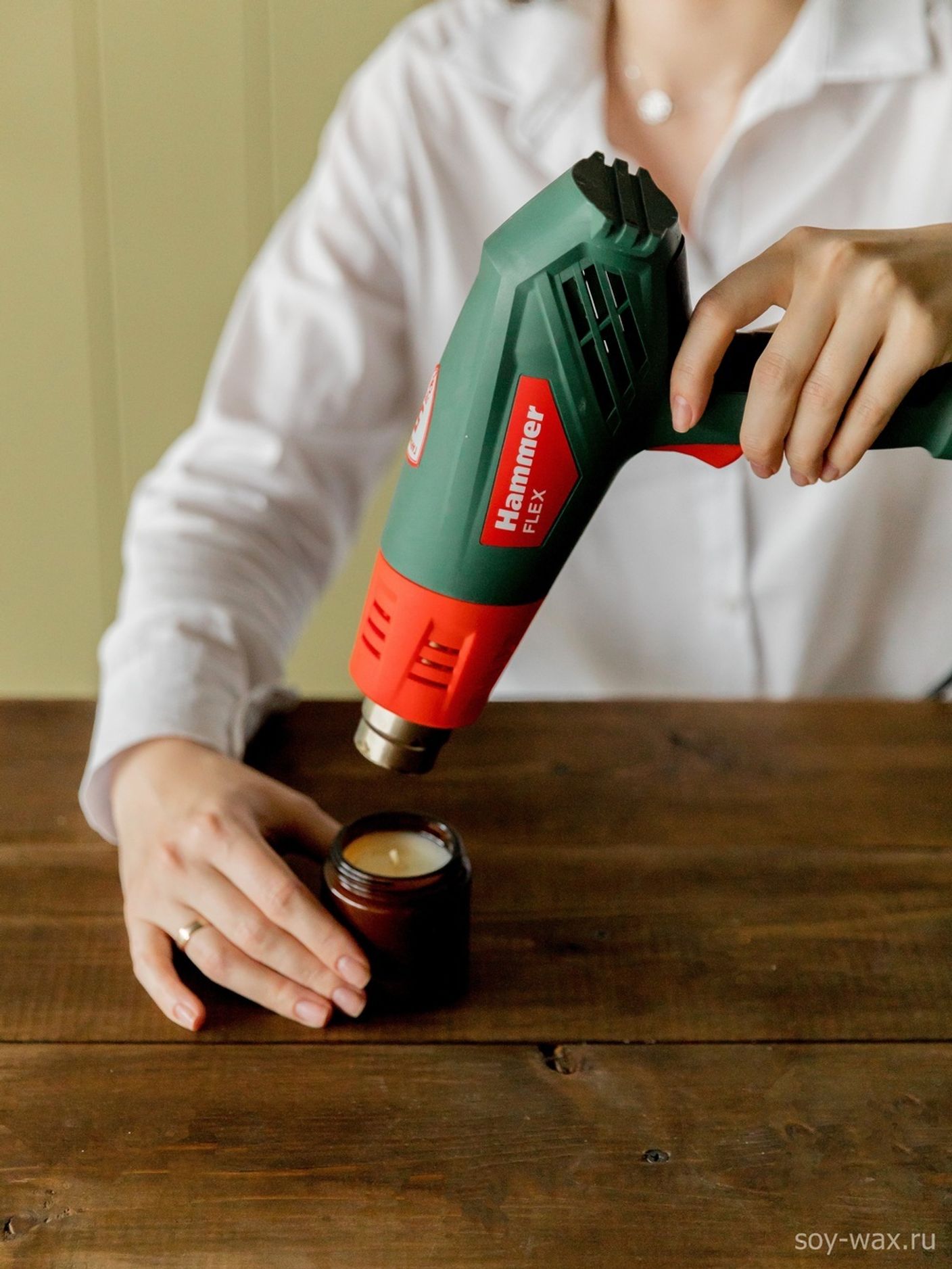 Если держать фен в одной точке, велика вероятность выжечь ароматическое масло. Как следствие, свеча не будет пахнуть при горении, пока не испариться воск 1-2мм.